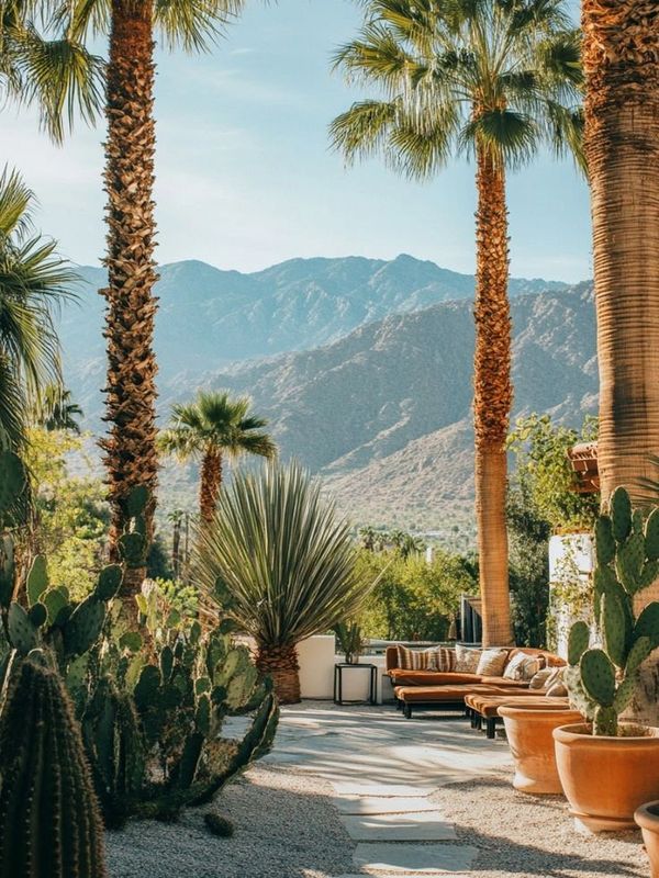 This spacious bedroom offers a serene desert retreat with soft, natural light and elegant touches. Unwind in luxury linens after a sun-soaked Palm Springs day.